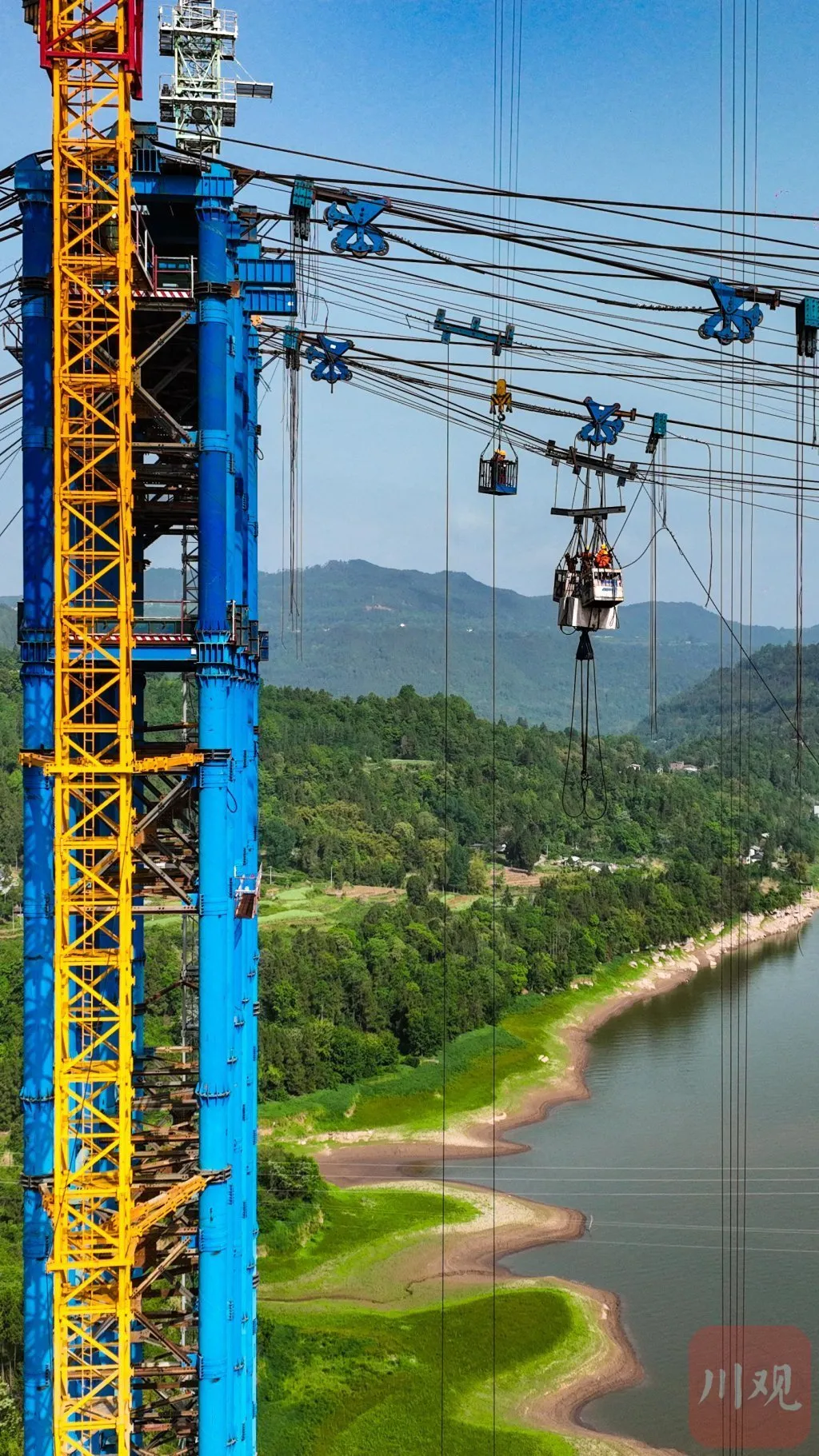近日,镇广高速通广段云台通江河特大桥项目建设现场,川桥吊装职业团队工人在超80米的高空中拆除部分吊装钢索。 C视觉张书浩 摄