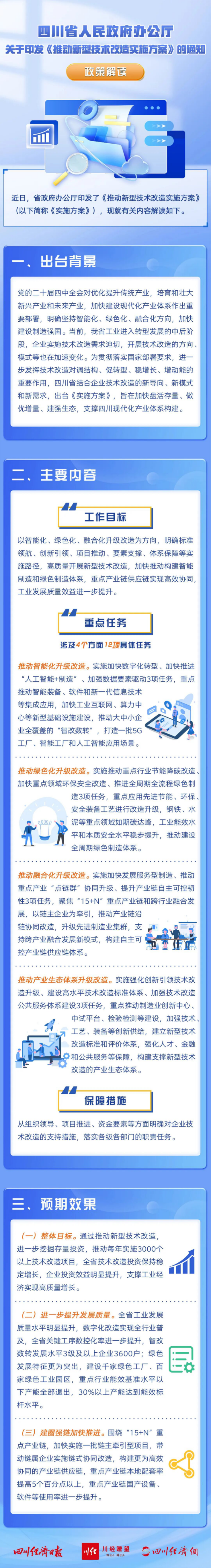 近日,四川省人民政府办公厅印发了《推动新型技术改造实施方案》(以下简称《实施方案》),聚焦六大优势产业和“15+N”重点产业链,以智能化、绿色化、融合化升级改造为方向,明确标准领航、创新引领、项目推动、要素支撑、体系保障等实施路径,高质量开展新型技术改造。该《实施方案》旨在进一步发挥技术改造对调结构、促转型、稳增长、增动能的重要作用,加快盘活存量、做优增量、建强生态,支撑四川现代化产业体系构建。